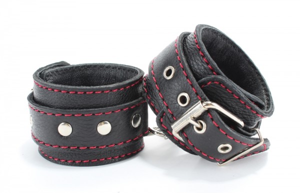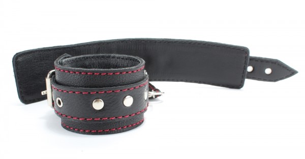 Наручники и оковы выполнены из натуральной кожи в черном цвете. Декор из металлических клепок